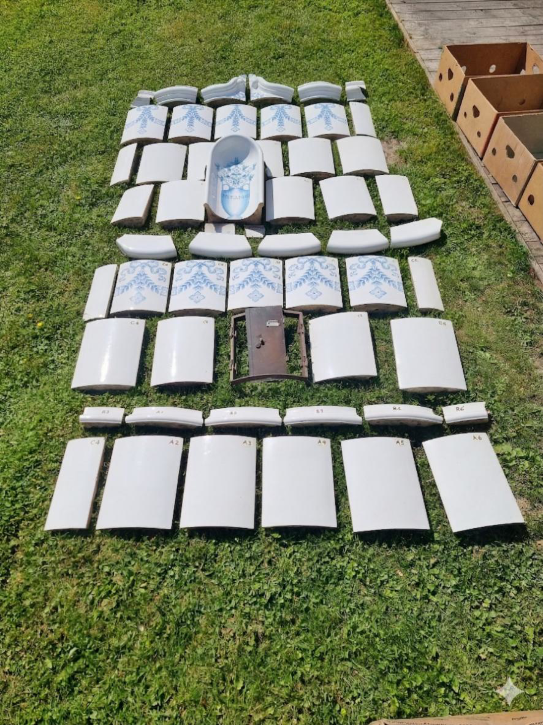 ANTIK BLÅVIT MÖNSTRAD KAKELUGN – KOMPLETT & NEDMONTERAD